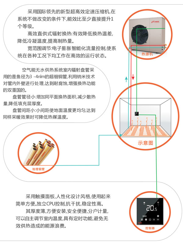 核心技术:工质直接冷凝辐射供热,夏季自动转换为风盘制冷